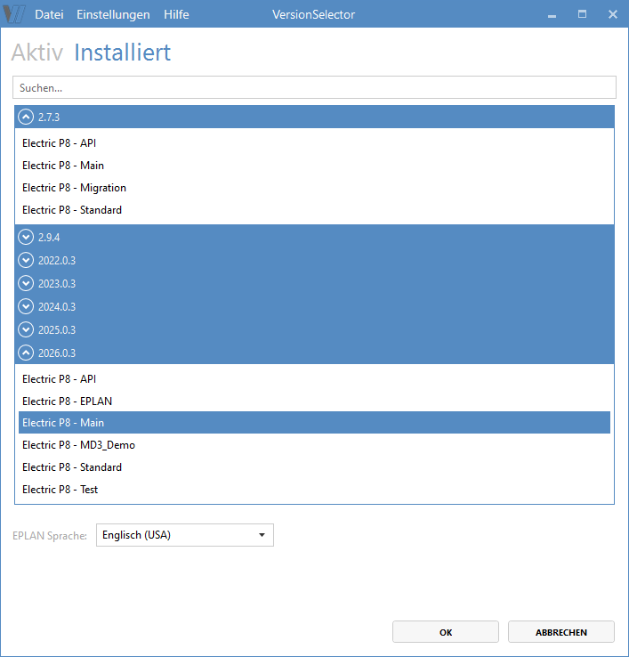 Folgendes Bild zeigt den Dialog mit den verfügbaren EPLAN-Installationen: